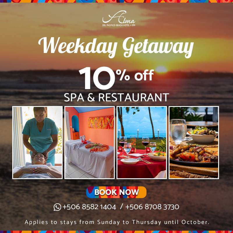 Situado en la playa a lo largo de la hermosa Playa Esterillos Este, en la región del Pacífico Central impresionantes de Costa Rica, nuestro hotel internacional de 4 estrellas es la última escapada junto al mar. La playa bañada por el sol, relucientes olas del mar y los acantilados verdes escarpadas crear un paisaje impresionante contra las villas pastel únicas de Alma del Pacifico. Senderos encantadores conducen a través de coloridos ornamentales, hierbas y huertas a su bungalow oasis. Y la increíble vida salvaje (incluyendo multitudes de peligro escarlata guacamayos, mariposas, iguanas y lagartijas) trae maravillas naturales de Costa Rica derecho a su puerta.